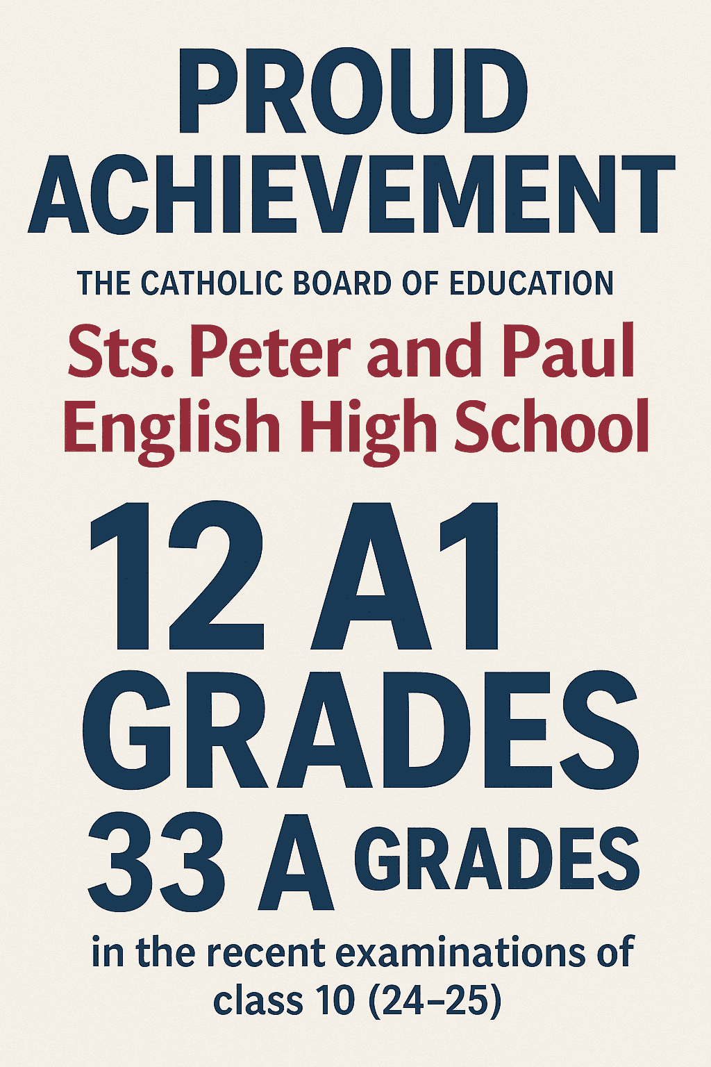 I extend my heartfelt congratulations to the Catholic Board of Education as Sts. Peter and Paul English High School has proudly secured 12 A1 grades and 33 A grades in the recent examinations of class 10 (24-25)