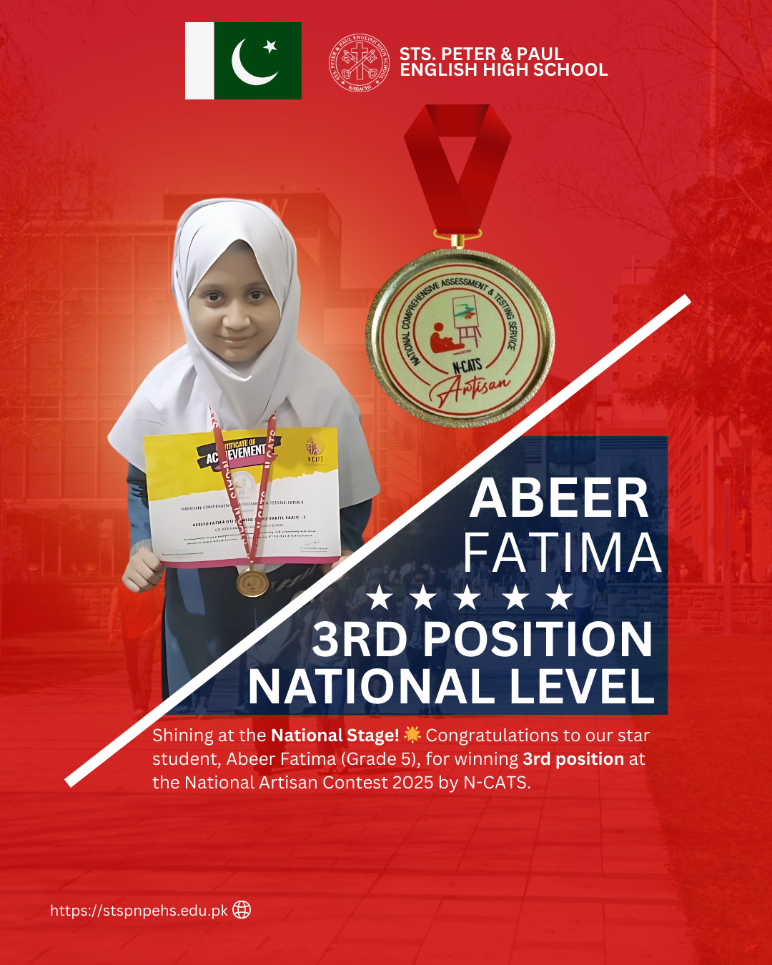 We are proud to announce that Abeer Fatima (Grade 5) of Sts. Peter & Paul English High School has brought great honour to our school by securing 3rd Position at the National Level in the National Artisan Contest 2025 organized by N-CATS. 🎉